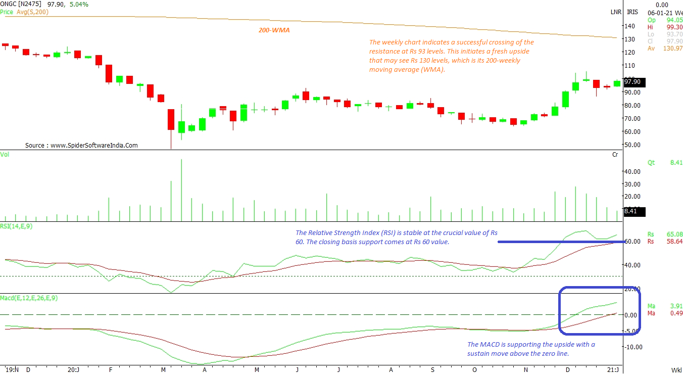 Oil & Natural Gas Corporation Ltd (ONGC): The weekly chart indicates a successful crossing of the resistance placed at Rs 93 levels. The consequent upside may lift the stock price to Rs 130 levels, which is its 200-weekly moving average (WMA). The MACD indicator is supporting the upside with a sustain move above the zero line. Moreover, the Relative Strength Index (RSI) is stable at the crucial value of Rs 60. The closing basis support comes at Rs 60 value.