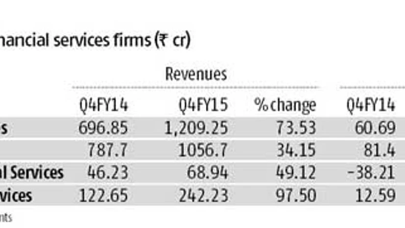 IIFL, Motilal Oswal, Geojit BNP Paribas and Edelweiss all had growth in their broking revenues as volumes in the equity markets picked up. IIFL Holdings saw its revenues from capital market activities increase by 74 per cent to Rs 129.7 crore from a year before. Motilal Oswal saw its revenues from broking jump 84 per cent to Rs 142 crore in the period. Edelweiss saw its agency business, which includes broking, grow 133 per cent to Rs 254 crore.