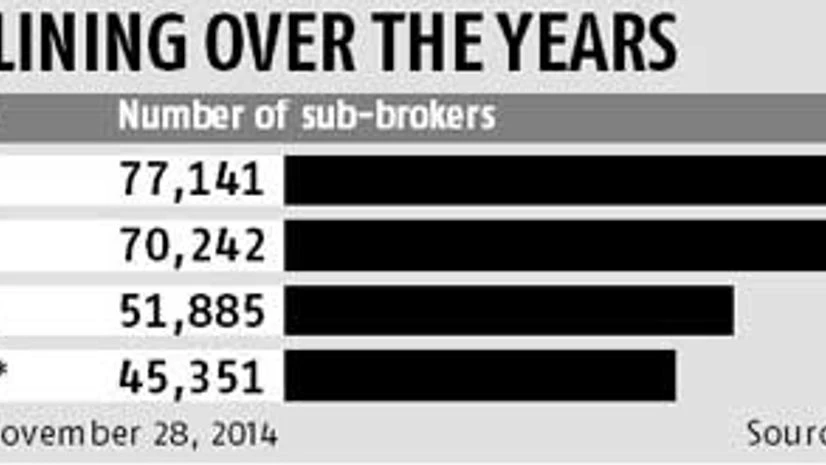 The number of sub-brokers has come down by nearly 13 per cent, from 51,885 in March 2014 to 45,351 at the end of November, shows data from the Securities and Exchange Board of India (Sebi). The count is down 40 per cent from March 2012.