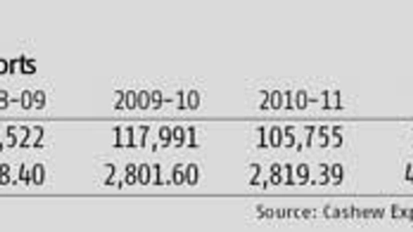 In the 11 months ended February, India's cashew kernel exports stood at 93,029 tonnes, a fall of 23.5 per cent compared to the year-ago period. According to estimates, exports in March could stand at 12,000-15,000 tonnes. Overall exports in 2012-13 could be 18-20 per cent lower than in 2011-12, when India exported 1,31,760 tonnes of cashew kernels, valued at Rs 4,391 crore (this was 24.6 per cent higher than in 2010-11).