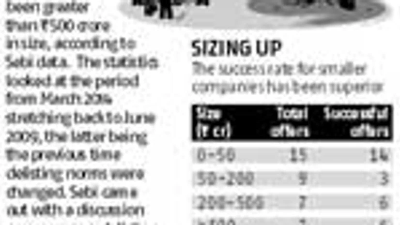 Smaller companies have been more successful at delisting, with 20 of the 38 successful delisting offers being less than Rs 100 crore in size. In contrast, less than a fifth of the successful delistings have been greater than Rs 500 crore in size, according to Sebi data. The statistics looked at the period from March 2014 stretching back to June 2009, the latter being the previous time delisting norms were changed. Sebi came out with a discussion paper on new delisting norms last month