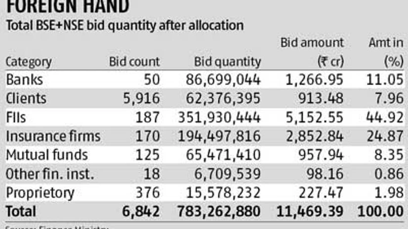 According to data released by the finance ministry on Friday, FIIs contributed Rs 5,152.55 crore of the total Rs 11,469.39 crore proceeds generated from the OFS.