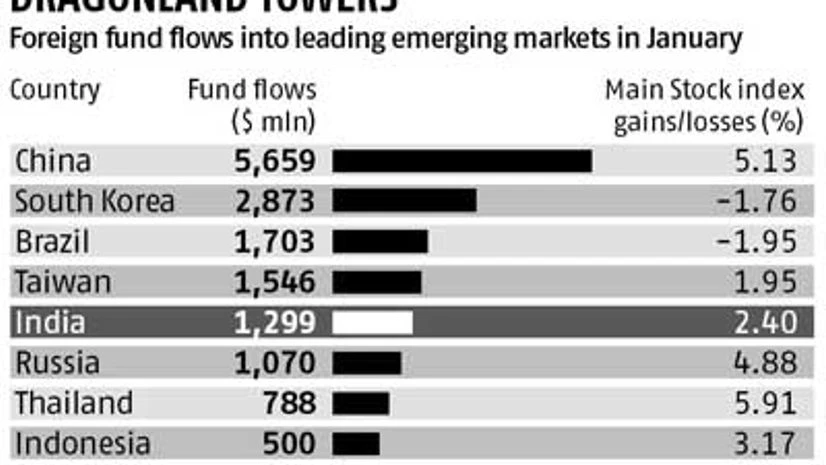 China recorded the highest foreign fund inflows of $5.6 billion in January among emerging countries, according to Kotak Securities. Brokers said funds might have reduced net allocations to India as the Sensex had risen almost 25 per cent in 2012, driven by foreign institutional flows to the tune of $25 billion.
