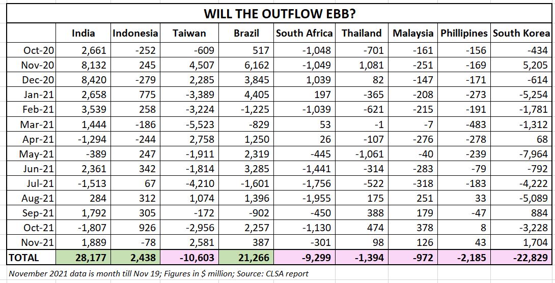 Foreign institutional investors (FIIs) have been in retreat mode across emerging markets (EMs). Over the past 12 months (since October 2020), they have withdrawn money from most EMs, including Taiwan, South Africa, Thailand, Malaysia, Philippines and South Korea, data shows. India, Indonesia and Brazil, however, have been an exception where the net FII flow has been still in the positive zone during this period, shows data.