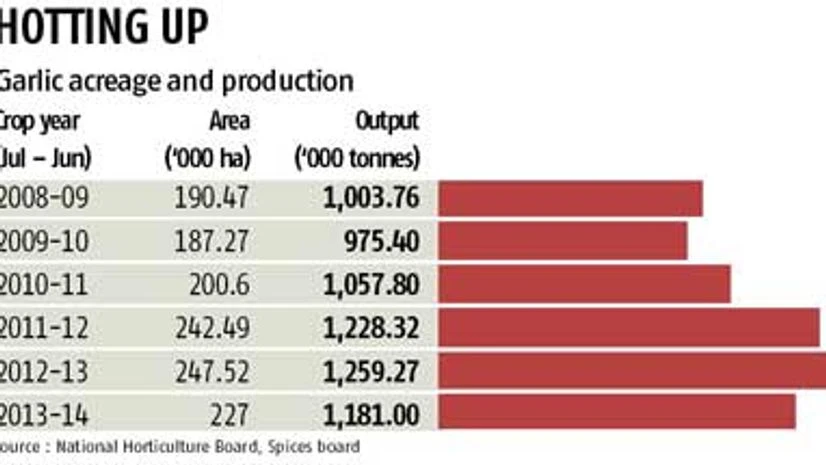 The Union agriculture ministry has, in its third advance estimate, anticipated garlic output at 1.18 million tonnes for 2013-14, down from 1.22 mt in the second advance estimate and 1.26 mt in the first. The National Horticulture Board put output at 1.26 mt the previous year.