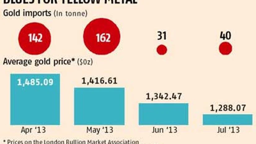 In April and May 2013, India imported 304 tonnes of gold, which had triggered several restriction on imports. However in June, imports fell to around $2 billion, while in July, at an average price of $1,288 per ounce, the imports bill is estimated to be around $1.65 billion. In July 2012, imports were 65 tonnes and at an average gold price of $1,594, the imports bill stood at $3.3 billion.