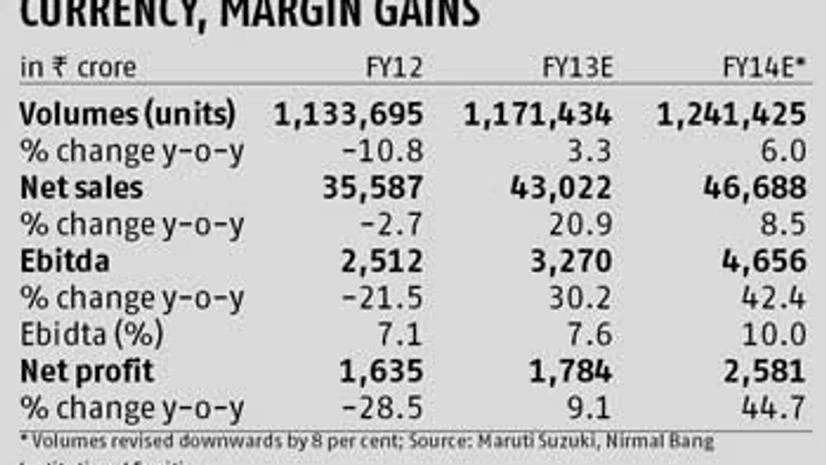 What has helped Maruti avoid the blushes in FY13 is the strong volumes from diesel-powered vehicles in its portfolio, which account for 30 per cent of volumes. The company ended the previous financial year with a three per cent year-on-year growth in volumes due to higher sales of diesel cars, which helped offset the steep drop of its petrol car portfolio. Nomura analysts believe the FY13 performance was led by strong order books for the Swift and Dzire models and higher exposure to rural markets where growth still remains strong. This also helped the company improve its market share by 300 basis points year-on-year to 45.7 per cent. However, going ahead, given that even diesel car sales have moderated, Gaurant Dadwal of Nirmal Bang has cut volume estimates for the company by eight per cent each in FY14 and FY15 to 1.241 million and 1.407 million, respectively. This reflects an increase of six per cent year-on-year for FY14, which nevertheless is in line with Maruti’s own guidance of a five to seven per cent growth.
