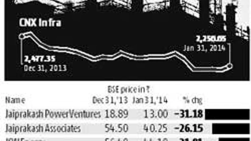 The CNX infra index comprises stocks of telecom, power, port, air, road, rail, shipping and utility companies. Among individual stocks, shares of Jaypee Group companies Jaiprakash Power Ventures and Jaiprakash Associates are among the top losers – cracking 28 per cent, and 27 per cent respectively, so far in 2014.