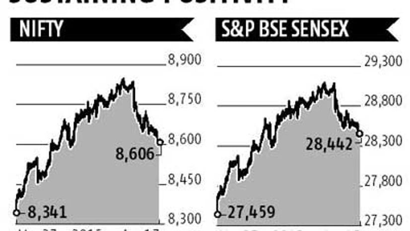 In the truncated week to April 17, the 30-share Sensex dropped 437 points or 1.5 per cent to end at 28,442 and the 50-share Nifty closed 174 points or 2 per cent lower at 8,606.