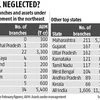 More, nearly two-thirds of these branches are in a single state, Assam. Tripura has five and Meghalaya comes third with four branches. Arunachal Pradesh, Nagaland and Manipur each have a single branch. Mizoram and Sikkim have none.