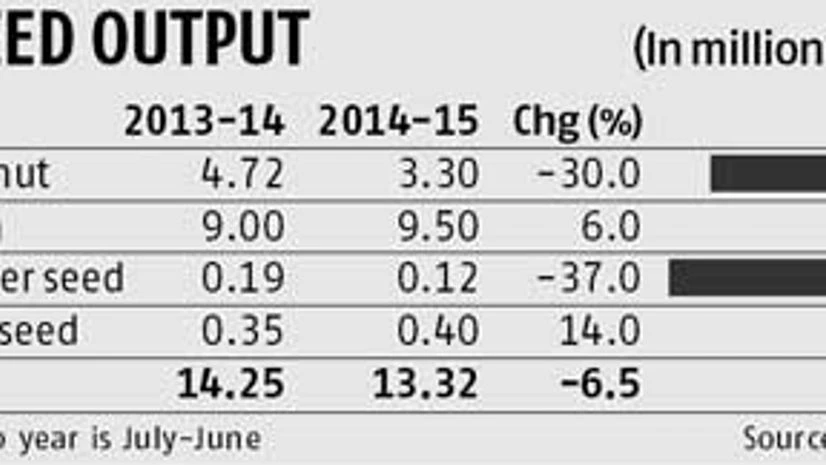 This year, oilseed production is expected to decline to 13.3 million tonnes (mt) from 14.2 mt last year. This is primarily because total area under oilseeds this year is estimated at 16.5 million hectares, compared with 18.2 million hectares last year. Also, this monsoon, rains were delayed by two-three weeks, which hit sowing of oilseeds such as groundnut, soybean, sunflower and sesame.