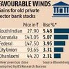 South Indian Bank rose 5.48 per cent to close at Rs 27.9, while Karnataka Bank closed at Rs 143.05, up 5.07 per cent. Federal Bank closed at Rs 147.5 (up 3.95 per cent), City Union Bank Rs 93.65 (up 3.31 per cent) and Dhanlaxmi Bank Rs 44.3o (up 2.31 per cent). Kotak Mahindra Bank closed at Rs 1,199.65, up 3.68 per cent. During the day, it hit a 52-week high of Rs 1,260.90. ING Vysya closed at Rs 816.8, up 0.32 per cent, hitting an intra-day high of Rs 849.