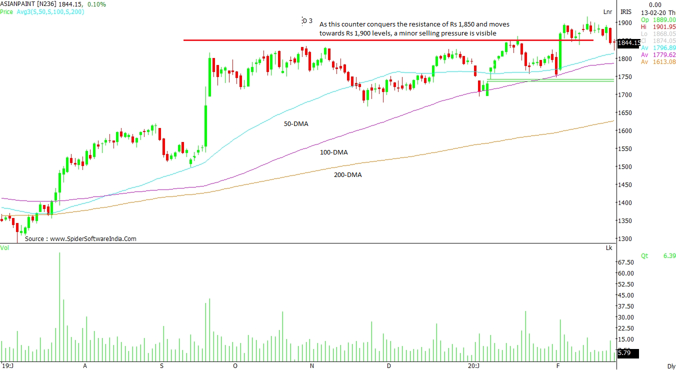 ASIAN PAINTS LTD (ASIANPAINT): As this counter has conquered the resistance of Rs 1,850 and moved towards Rs 1,900 levels, a minor selling pressure is witnessed. However, the trend remains positive and the crossing of resistance should result in a positive upside towards Rs 1,960 levels in the coming sessions. The immediate support comes at 50-day moving average (DMA) and 100 DMA located at Rs 1,813 and Rs 1,785 levels, respectively.