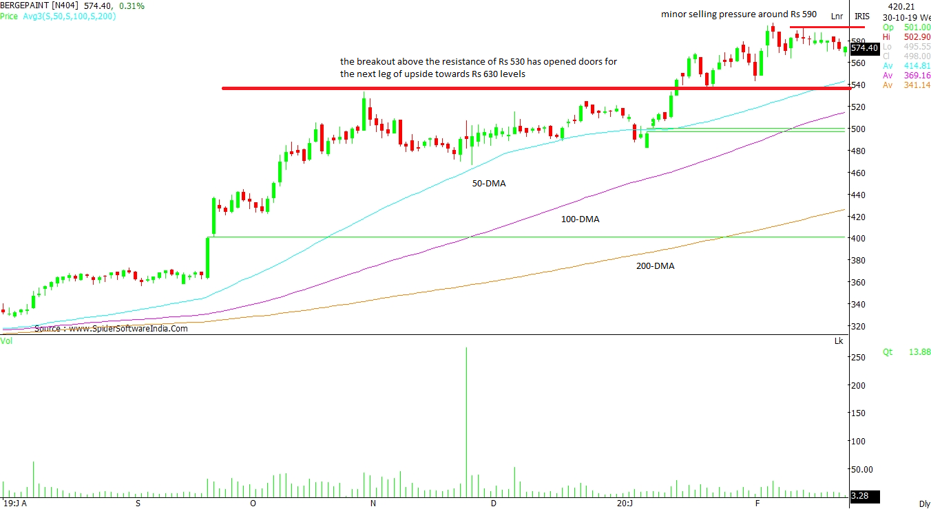 BERGER PAINTS INDIA (BERGEPAINT): The counter is not only trading above 200-DMA, but is defensively holding above 50-DMA placed at Rs 543 levels. Secondly, the breakout above the resistance of Rs 530 has opened doors for the next leg of upside towards Rs 630 levels. That said, a minor selling pressure can be seen around Rs 590 and it may eventually find support around Rs 565 - Rs 555 levels.