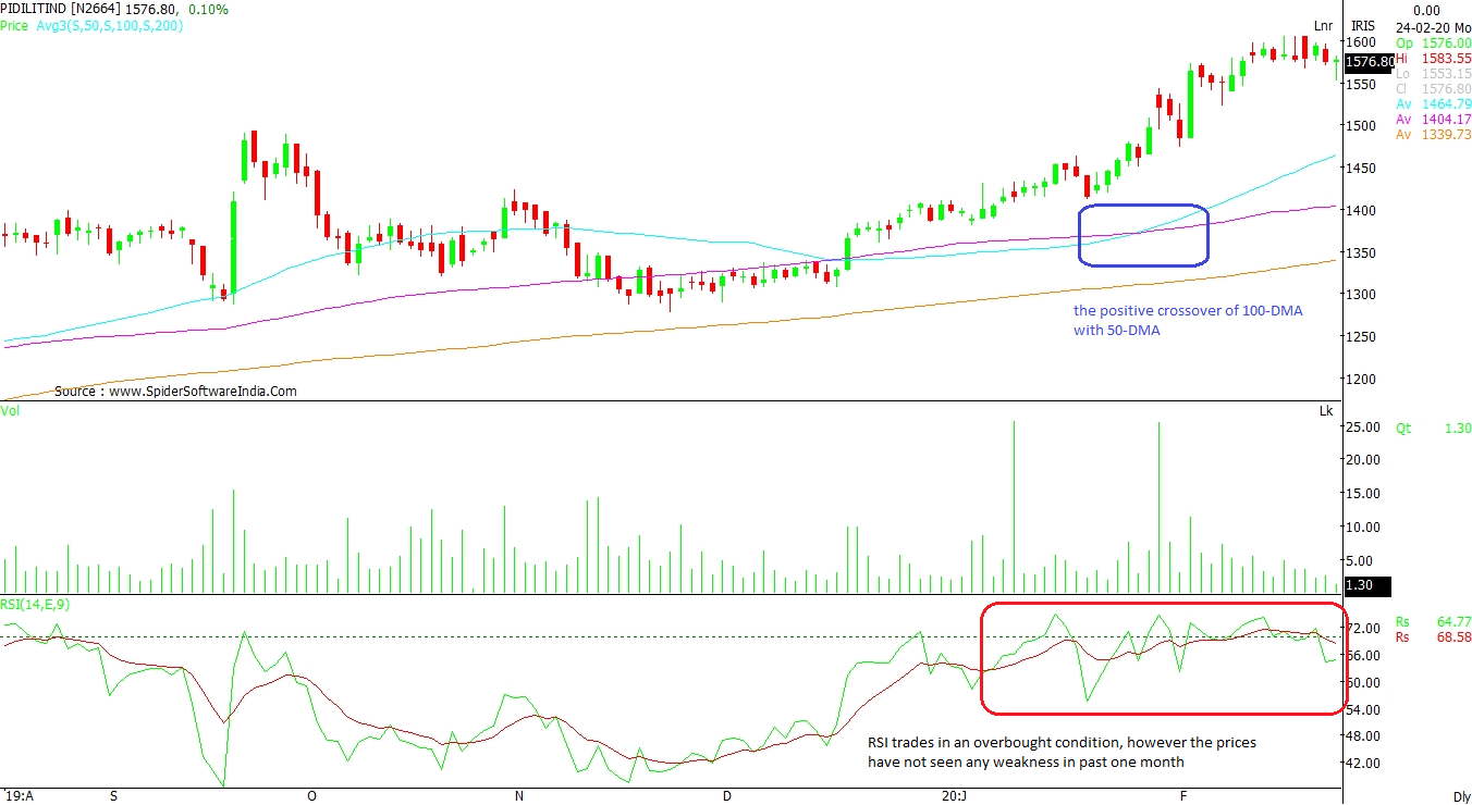 PIDILITE INDUSTRIES LTD (PIDILITIND): The formation of “Higher High, Higher Low” should result in an upside rally in the coming sessions. This coincides with the positive crossover of 100-DMA with 50-DMA at Rs 1,500 levels, as per the daily chart. The Relative Strength Index (RSI) index trades in an overbought condition, but the prices have not seen any weakness in the last one month.