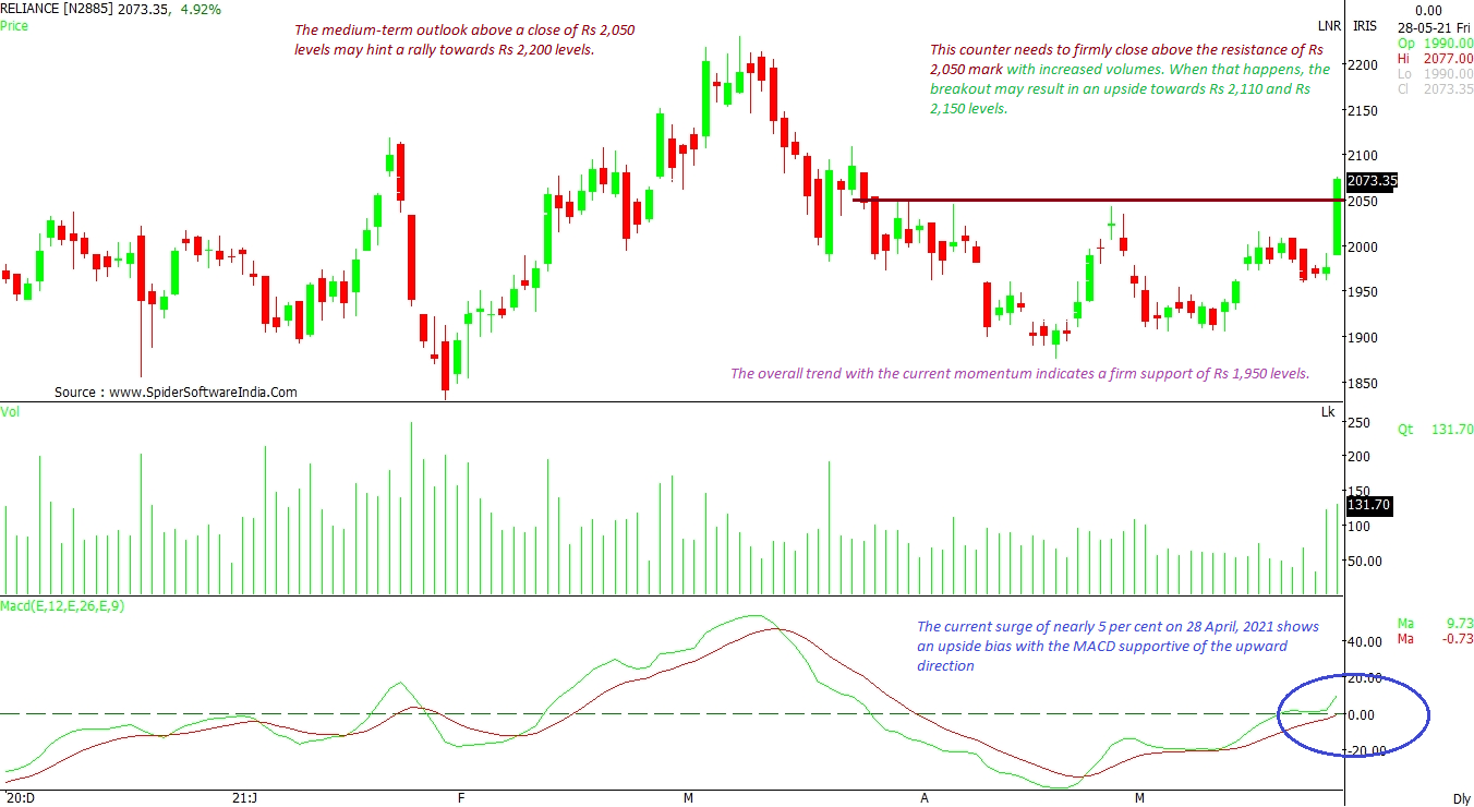This counter, according to charts, needs to firmly close above the resistance of Rs 2,050 mark with strong volumes. When that happens, the breakout may result in an upside towards Rs 2,110 and then Rs 2,150 levels. The surge of nearly 5 per cent on April 28 shows an upside bias with the Moving Average Convergence Divergence (MACD) also supportive of the upward direction, as per the daily chart.
