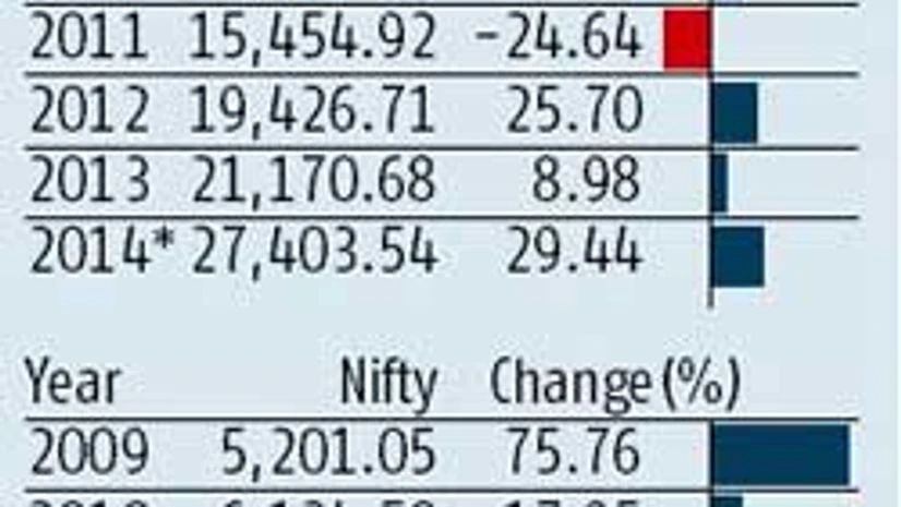 India’s stock market is set to deliver the best returns in five years, buoyed by robust buying from foreign investors and euphoria surrounding a new government coming to power at the Centre. This year, the BSE Sensex added 6,232 points, or 29.4 per cent, while the broader National Stock Exchange Nifty gained about 2,000 points, or 31 per cent — the most since 2009, when the indices had risen about 80 per cent each. While the markets had seen a ‘V-shaped’ recovery in 2009, following the global financial crisis, the returns this year have largely been in anticipation of a reversal in the macroeconomic environment, led by a reforms-oriented leadership at the Centre.