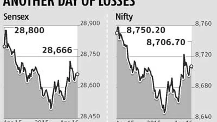 Tata Consultancy fell 1.7 per cent, while Infosys lost 0.9 per cent. Wipro, the third-biggest software exporter, fell for a second day, losing 0.8 per cent. Larsen retreated 1.9 per cent, while Dr Reddy's decreased two per cent. Foreign investors bought a net $73.5 million of domestic shares on April 13, taking the year's inflows to $6.35 billion, the most in Asia. They purchased $16 billion of stocks in 2014. The Sensex has gained 4.2 per cent this year and trades at 16 times projected 12-month earnings, compared with the MSCI Emerging Markets Index's multiple of 12.6.