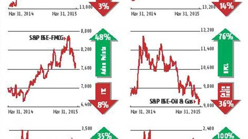 Financial year 2014-2015 was a year of big gains for equity investors. The BSE 200 Index ended the year with gains of 32 per cent, the best in five years, giving handsome returns to many investors (see chart). But index returns mask individual stock performances. Many leading stocks in sectors such as energy, metals, infrastructure and public sector banks witnessed a sharp decline and their stocks prices hit fresh lows. This divide is likely to persist in the new financial year given growth headwinds.