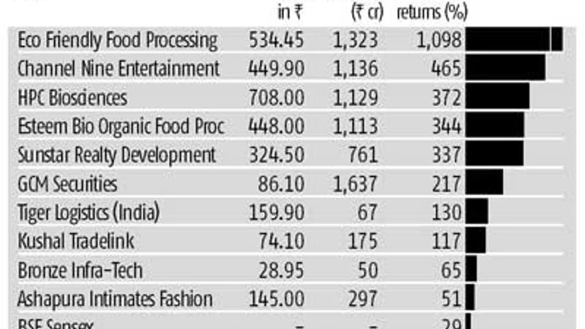 Other top performers include HPC Biosciences (up 371 per cent), Esteem Bio Organic (343.5 per cent), Sunstar Realty Development (337 per cent) and GCM Securities (216.5 per cent). Of these, Esteem Organic is also promoted by EFPL’s Sabharwal.