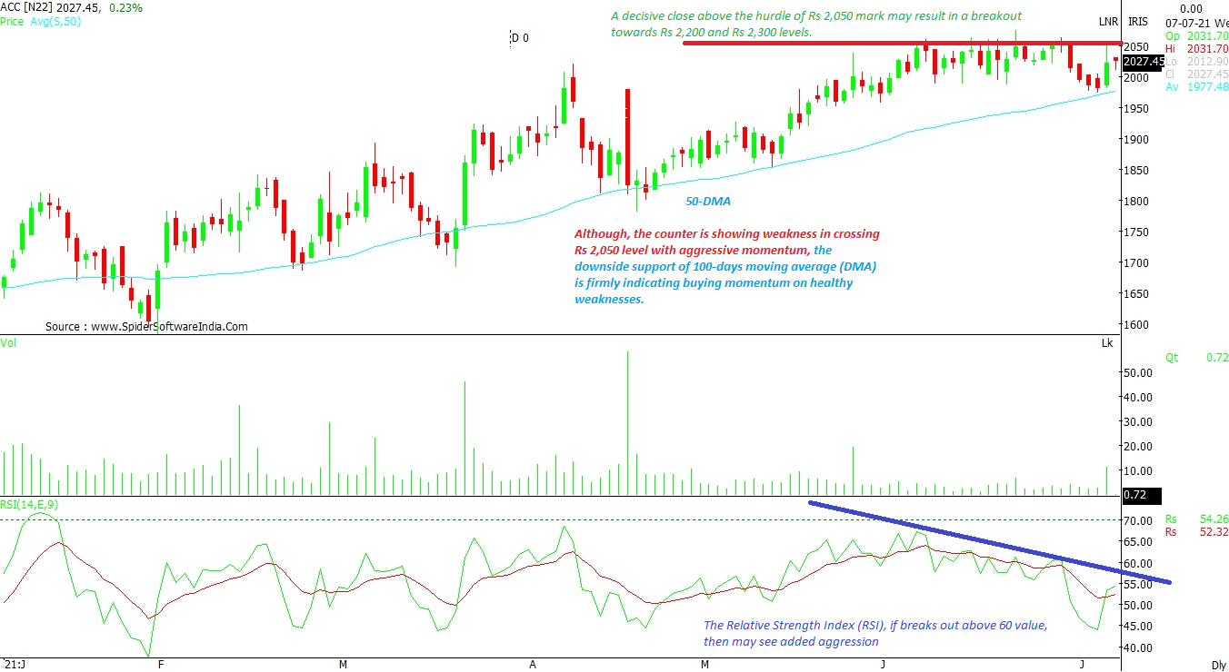 The downside support of 100 days moving average (DMA) firmly indicates buying momentum in case the stock witnesses any weakness. Although the scrip is having a tough time crossing Rs 2,050 level with aggressive momentum, a decisive close above this hurdle can result in a breakout towards Rs 2,200 and Rs 2,300. Furthermore, if the Relative Strength Index (RSI) breaks out above 60, the stock could see added aggression, suggest tech charts. CLICK HERE FOR THE CHART