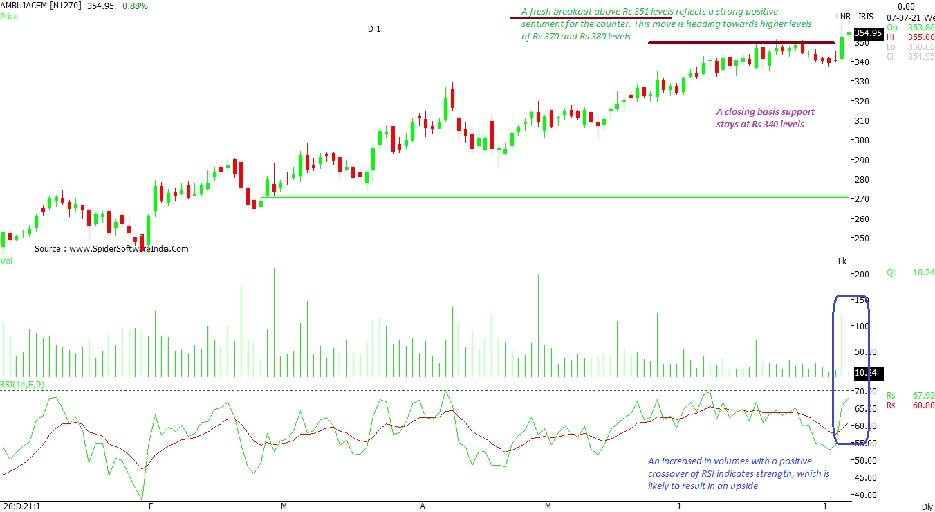 A fresh breakout above Rs 351 level reflects a strong momentum in the stock. Moreover, increased volumes, along with a positive crossover of RSI, indicates strength and further upside for the stock towards Rs 370 and Rs 380. The support for the stock stays at Rs 340 levels on a closing basis, according to tech charts. CLICK HERE FOR THE CHART