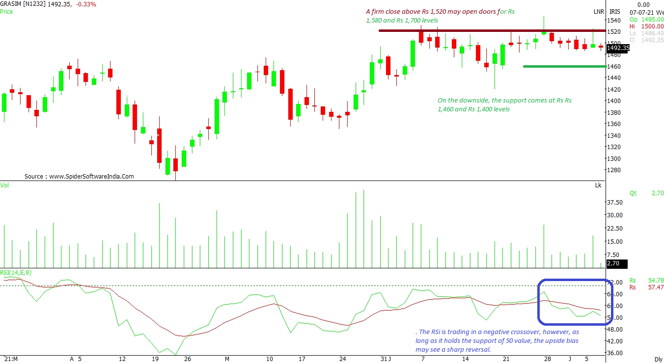 A firm close above Rs 1,520 may open doors for an up move towards Rs 1,650 and Rs 1,710 levels, as per the daily chart. On the downside, the supports are seen at Rs 1,460 and Rs 1,400 levels. The RSI is trading in a negative crossover, but if it holds the support of 50 value, the upside bias may see a sharp reversal. CLICK HERE FOR THE CHART
