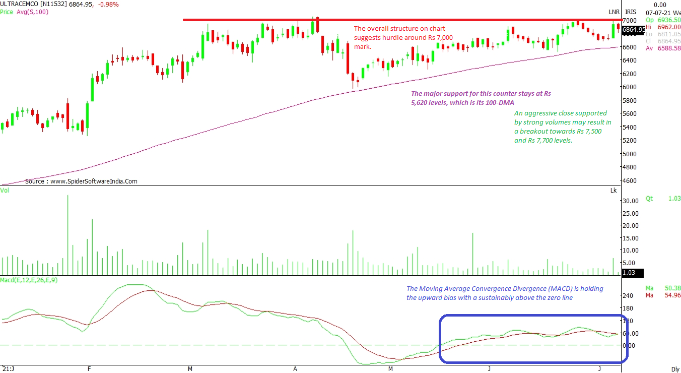 The major support for this stock is at Rs 5,620 level, which is its 100-DMA, while the hurdle is seen around Rs 7,000-mark. An aggressive close, supported by strong volumes, above this level may result in a breakout towards Rs 7,500 and Rs 7,700. Moreover, the Moving Average Convergence Divergence (MACD) is holding the upward bias above the zero line. CLICK HERE FOR THE CHART