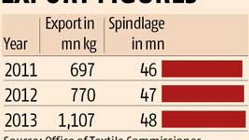 Mills added a combined 500,000 spindles in the past five years, anticipating a consistently high demand from China. There certainly was a big jump in 2013 over 2012, from 77 million kg of yarn export to 1,107 mn kg.