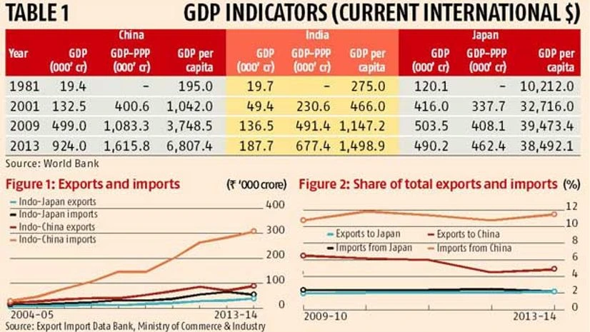 The risk is also associated with China's long-standing approach in sharing responsibility in global growth before the global economic crisis and, after, with its resistance to fair burden sharing. Table 1 reveals some stark contrasts that have emerged over three decades from the 1980s. Between 1981-2013, India's GDP increased from $19.7 thousand crore to $188 thousand crore, and China's from $19.4 thousand crore (lower than India's) to $924 thousand crore (about five times India's). Japan's GDP grew from $120 thousand crore (more than six times India or China) to $490 thousand crore (half of China and two and a half times India's).