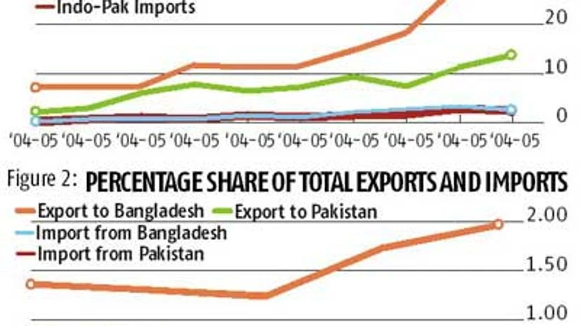 Because India is, physically and normatively, more expansive. Clearly, India has to play the larger role by persistently extending its hand in cooperation. Prime ministers Atal Bihari Vajpayee and Manmohan Singh tried albeit with very limited success. Despite the latest continual provocations, confidence-building measures have to be deepened by our new prime minister. Indo-Pak trade remains little compared to Indo-Bangla. Figure 1 reveals that while India's imports from Bangladesh and Pakistan have been comparable, the former has surpassed the latter. Further, India's exports have been far higher to Bangladesh than to Pakistan. India's integrated border posts at Attari with Pakistan and Petrapol with Bangladesh that oversee the procedures for trade and security reveal the difference in trade volumes handled despite the former's larger infrastructure to handle expansion. Pakistan's being a considerably smaller economy than India's, it seems natural that India should consider to unilaterally and comprehensively liberalise trade with Pakistan despite the latter's shorter positive list for which it allows trade with India. After all, as figure 2 shows, India's share of trade with Pakistan to its total trade remains minuscule, at 0.7 per cent of its total exports and at 0.1 per cent of its total imports in 2013-14, lower figures than with Bangladesh. Opening up trade with Pakistan fully, to begin, India's exports would jump leading to both pecuniary and non-pecuniary gains. Pakistan's exports should also improve.