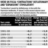 The British monetarist Tim Congdon (in his article "In praise of expansionary fiscal contraction", which appeared in Economic Affairs this year) has provided some support. He examines the change in the cyclically adjusted public sector net borrowing (PSBR), with a reduction representing fiscal tightening, and sees if it is accompanied by below trend growth and a reduction in the "output gap" with more spare capacity and higher unemployment. The "output gap" is measured with reference to the level of potential output when unemployment is at the monetarist "natural rate" - that is, the non-accelerating inflation rate of unemployment (Nairu). The "output gap" is then given by the percentage difference between actual gross domestic product (GDP) in constant prices and estimated potential GDP. So above-potential output is associated with a positive value of the output gap and beneath-potential output with a negative value. (See OECD Economic Outlook 1995, page 74). Mr Congdon's estimates of the changes in the output gap and in the PSBR for 1981 to 2013 for the United Kingdom from the International Monetary Fund are in the table. If the Keynesian view is valid, one should see an inverse relationship between changes in the cyclically adjusted Budget balance (PSBR) and changes in the output gap.