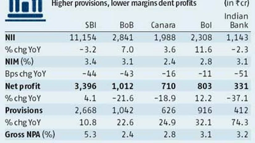 Most of the large PSBs — State Bank of India (SBI) , Bank of Baroda (BoB), Canara Bank, Indian Bank and Bank of India (BoI) — saw a sharp rise in their provisioning for bad loans (up between 10 and 81 per cent).