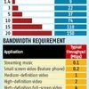 Efficient data transmission requires even broader bands. The chart shows how capacity increases per MHz with broader bands, and the bandwidth in terms of megabits per second (Mbps) needed for services.