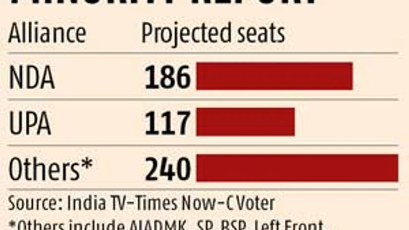 The poll was conducted by India TV-Times Now-C Voter. The pollsters said the survey was conducted between August and October, covering the period before and after Narendra Modi's elevation as the Bharatiya Janata Party's prime ministerial candidate. It says the BJP-led National Democratic Alliance (NDA) will be the largest bloc, with 186 seats; the UPA will get 117. In the 2009 elections, the NDA's was 159 and the UPA managed 259 seats. The survey projects regional parties to get 240 seats.
