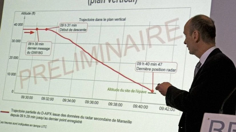 Remi Jouty, director of BEA, the French Air Accident Investigation Agency displays information on the trajectory of the Germanwings aircraft during a press conference at Le Bourget airport, north of Paris