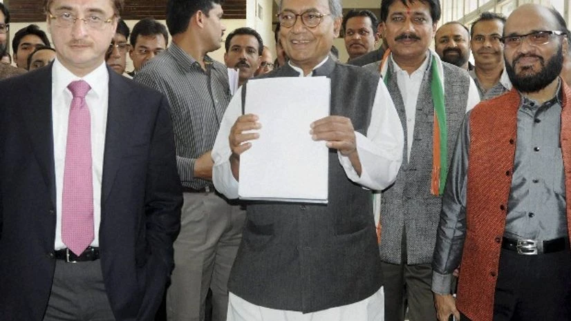 AICC General Secretary Digvijaya Singh shows documents as he arrives at the office of Special Investigation Team in connection with MP Professional Examination Board Scam, in Bhopal