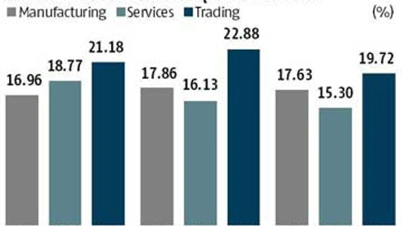 Returns in services and trading appear to have declined as competition in these sectors is much more intense due to their higher RoE and smaller asset bases, as compared to the more capital-intensive manufacturing sector. Another reason for the decreasing trend may be the admittance of higher rate of depreciation on assets like computer hardware and software, which form a major part of the assets in the service sector.