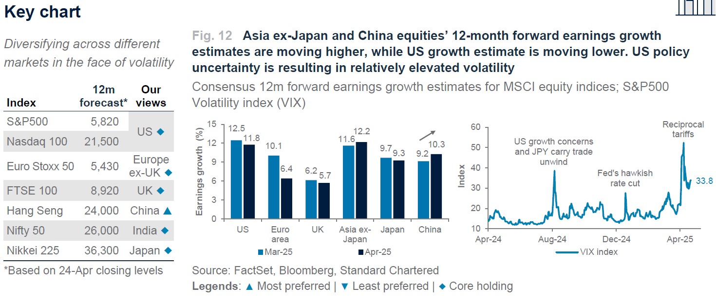 As an asset class, analysts at Standard Chartered have downgraded equities across all major regions, including India, to 'neutral' as policy uncertainty (regarding US tariffs) and a high level of volatility is resulting in a poor risk-reward. They expect the Nifty50 index to hit the 26,000 mark in 12 months, which is around 7 per cent higher from the current levels.