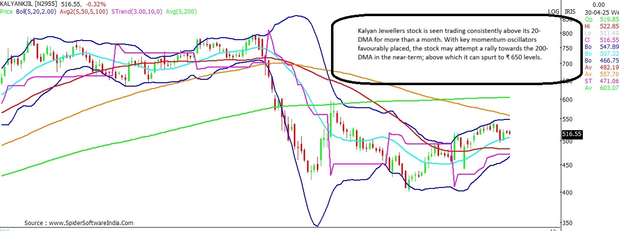 Kalyan Jewellers stock has witnessed a tumultuous ride in the stock market this year. The stock witnessed an over 40 per cent swing in its share price, twice thus far in the four months of the calendar year 2025, and four times it has swung more than 30 per cent. Kalyan Jewellers started the year with a 47 per cent crash - as the stock tumbled from a high of ₹ 795 on January 2 to a low of ₹ 421 on January 28. The stock, thereafter, witnessed a swift 41 per cent pullback in a matter of mere six trading sessions, as the stock spurted to a high of ₹ 594 on February 4. Since then, the stock has witnessed a gradual consolidation and hit a low of ₹ 399 on March 11, and a high of ₹ 545 on April 23. The fall from its February high to the March low implies a fall of near 33 per cent, whereas the recent pullback accounts to 36.5 per cent recovery. Since March 20, Kalyan Jewellers stock has been trading consistently above its short-term - the 20-Daily Moving Average (20-DMA), which now stands at ₹ 505. That apart, key momentum oscillators on the weekly chart have witnessed positive crossovers - suggesting that the stock may trade with a favourable bias in the near-term. READ STOCK MARKET LIVE UPDATES HERE Kalyan Jewellers is scheduled to announce its March quarter results next week, on May 8. Given the sharp volatility so far this year, is Kalyan Jewellers stock ready for its next big move? Here's what could happen next as per the technical charts. ALSO READ: How to trade Bajaj Finance, Bajaj Finserv stocks post Q4FY25 results?