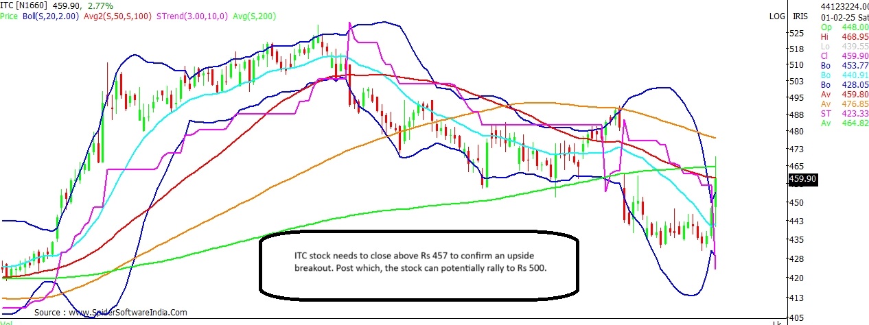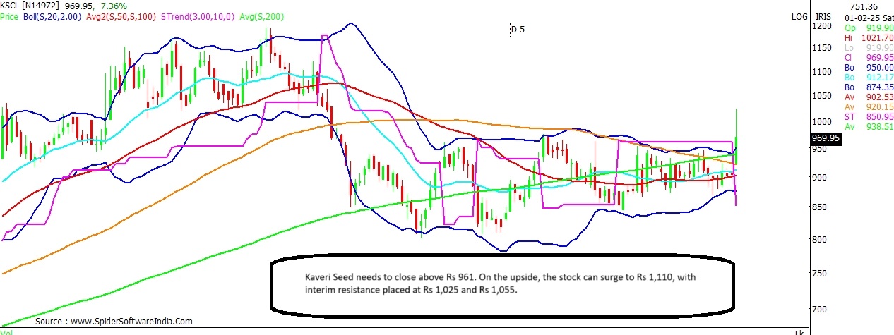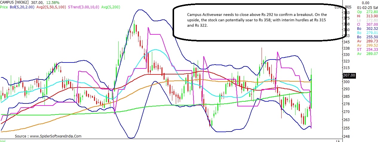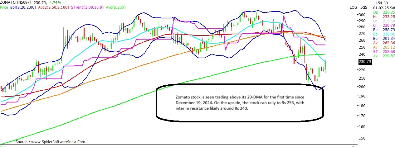 Equity market swung wildly between zones as the finance minister Nirmala Sitharaman unveiled the Union Budget proposals for the upcoming financial year 2025-26. The finance minister announced measures to boost rural growth with focus on agriculture, education, leather and MSME sector. Nirmala Sitharaman in her speech stated that she would want to provide opportunities of growth in rural India, so that moving out does not become a necessity, but a matter of choice. With an aim to rationalise taxation, Sitharaman announced measures on the TDS and TCS front, while increasing the tax exemption limit on personal income tax to Rs 12 lakh. Post the Budget announcement, even as the benchmark indices, the BSE Sensex and the NSE Nifty traded in the negative zone in today's special trading session on account of the Union Budget, several individual stocks logged smart gains. Here's a technical analysis on 5 stocks that could see gains in the near-term, post the Union Budget. ITC Current Price: Rs 460 Upside Potential: 8.7% Support: Rs 457; Rs 441 Resistance: Rs 465; Rs 477 ITC has witnessed a sharp rally post the Union Budget, likely on no tinkering of tax rates on cigarettes. The stock is attempting a fresh breakout on the daily chart; a close above Rs 457 shall confirm the same. That apart, the stock is seen trading above its 20-DMA (Daily Moving Average) for the second day in a row. CLICK HERE FOR THE CHART Technical chart suggests the stock could extend the gains and test levels of Rs 500 in the near-term. Interim resistance for the stock stands at Rs 465 and Rs 477 levels. In case of a dip, the 20-DMA at Rs 441 should act as a near-term support. ALSO READ: Consumption stocks rally on Budget proposals; Maruti Suzuki surges 7% Bata India Current Price: Rs 1,327 Upside Potential: 11.9% Support: Rs 1,265 Resistance: Rs 1,334; Rs 1,410 Bata India stock is seen trading with a positive bias for the fourth straight trading day. The stock at present is seen testing resistance around the super trend line on the daily scale at Rs 1,334. Key momentum oscillators on the daily chart seem to be favourably placed; as such the stock could bounce back to Rs 1,485; with interim resistance seen at Rs 1,370 and Rs 1,410 levels. The key support on the downside stands at Rs 1,265. CLICK HERE FOR THE CHART Zomato Current Price: Rs 229 Upside Potential: 10.5% Support: Rs 222; Rs 216 Resistance: Rs 240 Zomato stock is seen trading at its highest level in the last two weeks. The stock has nearly recovered its complete fall post the Q3 results, and is now seen trading around its 20-DMA, which stands at Rs 230. Further, key momentum oscillators on the daily chart are showing a positive crossover, thus indicating that the stock could trade with a positive bias in the near-term. CLICK HERE FOR THE CHART Zomato on the upside can potentially rally to Rs 253; with interim resistance for the stock placed at Rs 240. In case of a dip, the stock is expected to find support around Rs 222 and Rs 216 levels. ALSO READ: Insurance stocks zoom after Budget 2025; Star Health, SBI Life gain upto 7% Campus Activewear Current Price: Rs 294 Upside Potential: 21.8% Support: Rs 283; Rs 265 Resistance: Rs 315; Rs 322 Campus Activewear is also seen attempting a breakout on the daily chart; a close above Rs 292 shall confirm the same. On the upside, the stock can potentially surge to Rs 358; with interim resistance likely around Rs 315 and Rs 322 levels. The key support on the downside stand at Rs 283 and Rs 265 levels. CLICK HERE FOR THE CHART Kaveri Seed Company (KSCL) Current Price: Rs 973 Upside Potential: 14.1% Support: Rs 961; Rs 910 Resistance: Rs 1,025; Rs 1,055 KSCL stock needs to close above Rs 961 to confirm an upside breakout on the daily chart. The key momentum oscillators on the daily and weekly chart are also favourably placed. Thus, the stock can potentially surge to Rs 1,110. Interim resistance for the stock can be expected around Rs 1,025 and Rs 1,055. The key support for the stock stands at Rs 910. CLICK HERE FOR THE CHART