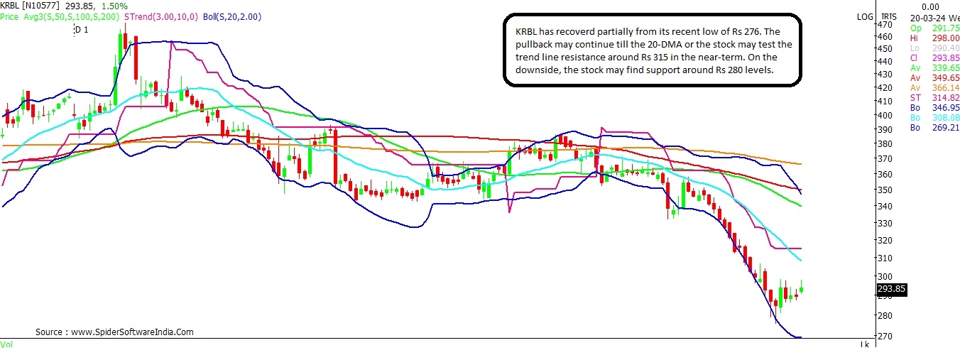 Thus, the current pullback in KRBL may extend, and the stock may test its 20-DMA on the upside at Rs 308 or rally further higher towards the trend line resistance at Rs 315. On the downside, the stock may seek support around Rs 280 levels. CLICK HERE FOR THE CHART