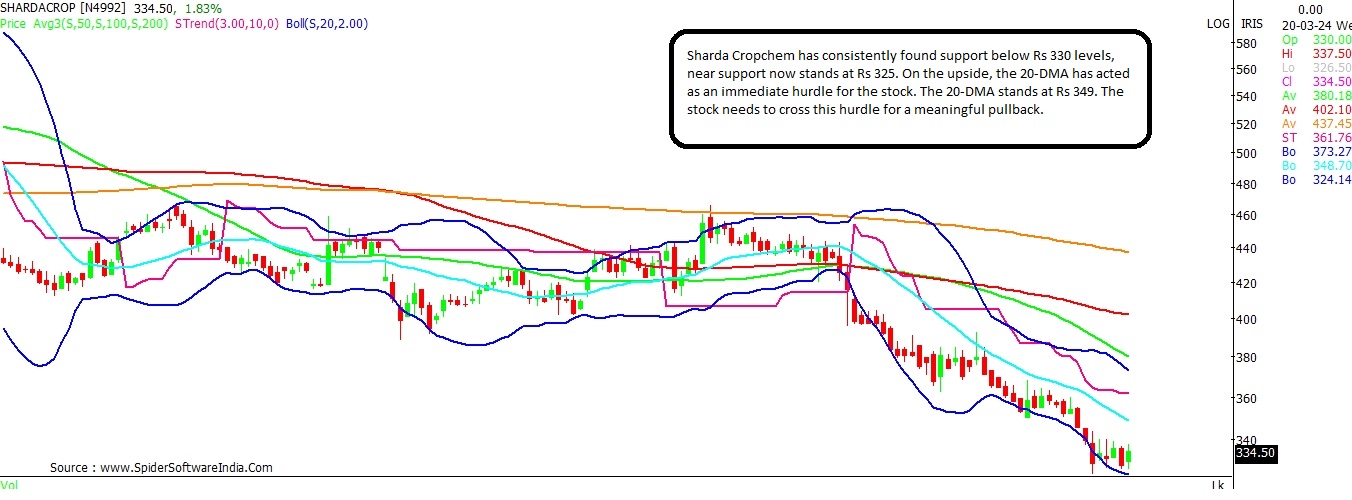 Sharda Cropchem has consistently found support below Rs 330 levels in recent trading sessions. The positive divergence on the RSI coupled with presence of near support at Rs 324 in the form of lower-end of the Bollinger Bands on the daily scale augurs well for the stock.