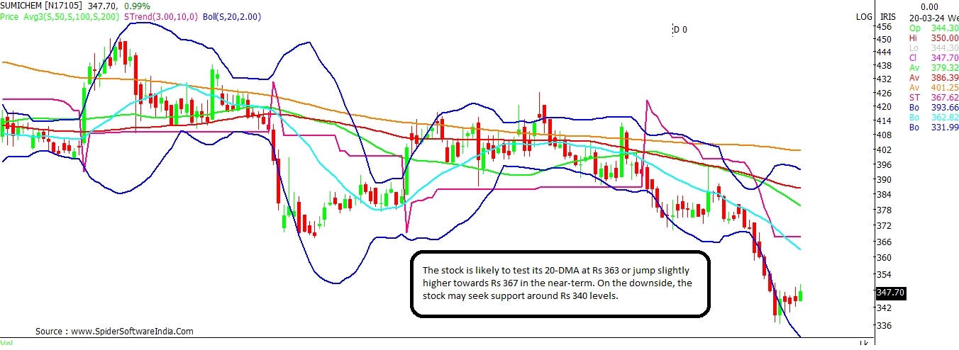 Sumitomo Chemical is likely to test its 20-DMA at Rs 363, or jump slightly higher to Rs 368, wherein lies the trend line resistance in the near-term. The stock has seen a brief recovery from oversold levels, and now after the RSI, the MACD too seems on course to turn favourable. On the downside, the recent lows around Rs 340 may provide cushion for the stock. CLICK HERE FOR THE CHART