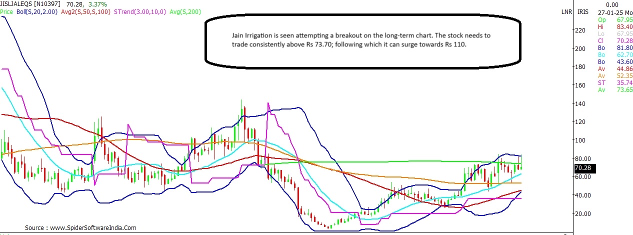 Finance Minister Nirmala Sitharaman to present the Union Budget 2025 on Saturday, February 01, 2025. The finance minister in the July Budget had said that the government will provide Rs 11.11 lakh crore for capital expenditure for 2024-25 and introduce viability gap funding to spur private investment in infrastructure. Ratings agency ICRA in a note on Budget expectations said, the government should target a capital spending of Rs 11 trillion in the Budget for the next fiscal while giving inflation-adjusted relief on personal income tax to boost consumer spending. In general, an increase in government capital expenditure (capex) benefits the economy by stimulating infrastructure development, creating jobs and boosting demand across sectors. Infra-related sectors especially road, railways and power tend to benefit, alongside a ripple effect to rural economy. ALSO READ: Budget 2025-26: Five key focus areas to accelerate growth amid uncertainty As such, here's a technical outlook on 5 stocks that could benefit from a potential hike in capex in Budget 2025. Larsen & Toubro Current Price: Rs 3,418 Upside Potential: 12.6% Support: Rs 3,380; Rs 3,300 Resistance: Rs 3,600; Rs 3,670 Larsen & Toubro stock is seen testing the 50-MMA (Monthly Moving Average) support around Rs 3,380 on the long-term chart; below which key support for the stock stands at Rs 3,300 - its super trend line on the weekly chart. These two are the key levels as L&T has not closed below these two supports since July 2022. CLICK HERE FOR THE CHART As long as these support levels are held, L&T can potentially swing back towards Rs 3,850 levels. Interim resistance for the stock can be expected around Rs 3,600 and Rs 3,670. On the flip side, in case, L&T breaks the support zone, it can slip to Rs 3,200; below which a sharper slide towards Rs 2,750 levels seems likely. ALSO READ: Can Budget 2025 trigger a rally in rail stocks? Tech view here Siemens Current Price: Rs 5,792 Downside Risk: 18.9% Support: Rs 5,410; Rs 4,700 Resistance: Rs 6,170; Rs 6,400 Towards, the end of December Siemens broke its key super trend line support on the weekly chart for the first time since November 2020. Post which, the stock has extended the fall and is now seen trading close to its 20-MMA support, which stands at Rs 5,410. On the downside, the stock can drift towards Rs 4,700 levels. CLICK HERE FOR THE CHART The near-term bias for the stock is expected to remain negative as long as the stock trades below Rs 6,400, with near resistance seen at Rs 6,170. NTPC Current Price: Rs 322 Upside Potential: 19.6% Support: Rs 325; Rs 305; Rs 301 Resistance: Rs 344; Rs 370 NTPC, recently, had given a positive breakout on the daily chart and since then is seen trying hold the 20-DMA (Daily Moving Average), which stands at Rs 325. The near-term bias for NTPC is likely to remain cautiously optimistic as long as the stock trades above Rs 305 - Rs 301 support zone. CLICK HERE FOR THE CHART On the upside, the stock can potentially bounce back to Rs 385 levels, with interim resistance placed around Rs 344 and Rs 370 levels. ALSO READ: Time to buy, sell, or hold stocks amid market sell-off? Analyst view here Power Grid Corporation Current Price: Rs 286 Downside Risk: 11.5% Support: Rs 275; Rs 263 Resistance: Rs 301; Rs 311 Power Grid stock is on the verge of giving a negative breakout on the weekly scale; a weekly close below Rs 294 shall confirm the same. As such, the stock could then be headed towards the 100-WMA (Weekly Moving Average) placed at Rs 253. Interim support for the stock can be anticipated around Rs 275 and Rs 263. In case of a pullback, the stock is expected to counter resistance at Rs 301 and Rs 311 levels. CLICK HERE FOR THE CHART Jain Irrigation Current Price: Rs 70.30 Upside Potential: 56.5% Support: Rs 67.70; Rs 62.70 Resistance: Rs 73.70; Rs 83.50 Jain Irrigation is seen testing resistance around its 200-MMA, placed at Rs 73.70 for the last seven months. The bias as per the daily and weekly chart seems cautiously positive. However, the stock needs to conquer the 200-MMA hurdle and trade consistently above the same for further gains to emerge. CLICK HERE FOR THE CHART As such, the stock can potentially surge to Rs 110 levels; with interim resistance seen at Rs 83.50. On the downside, the stock has near support at Rs 67.70, below which key support stands at Rs 62.70. Break of this support zone can drag the stock back to Rs 50-odd levels.