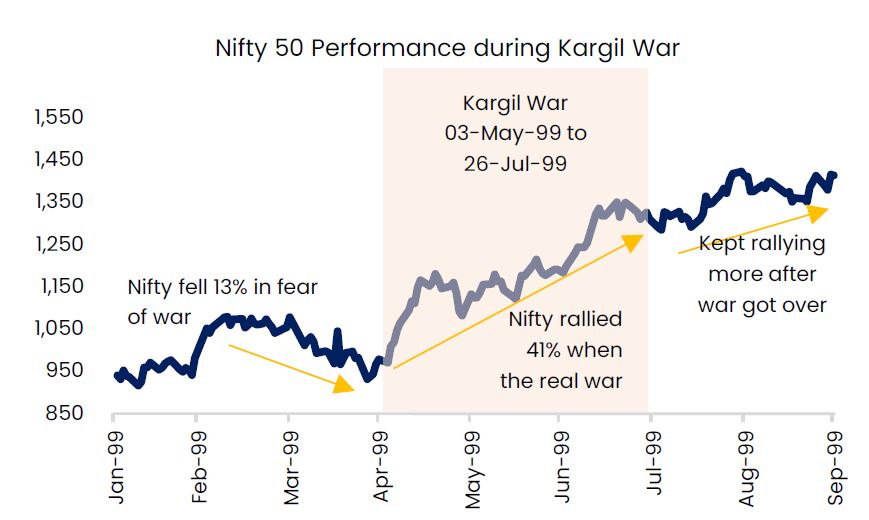 The Kargil confrontation between India and Pakistan, for instance, saw a sharp market correction in mid-1999. However, the markets rallied sharply as realisation dwelled that the conflict would not last long. CHECK HERE
