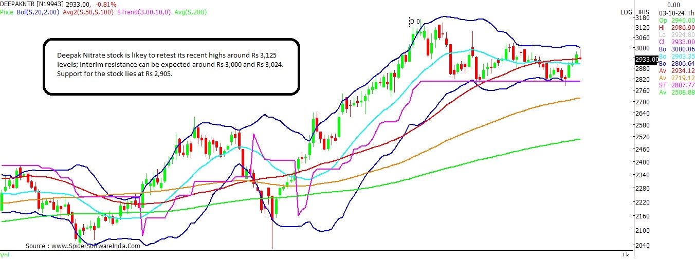 Deepak Nitrite is likely to retest its recent highs around Rs 3,125 levels. The stock recently cleared the 20-DMA hurdle at Rs 2,905. The same is expected to act as an immediate support going ahead. Interim resistance for the stock is seen at Rs 3,000 and Rs 3,024 levels. CLICK HERE FOR THE CHART
