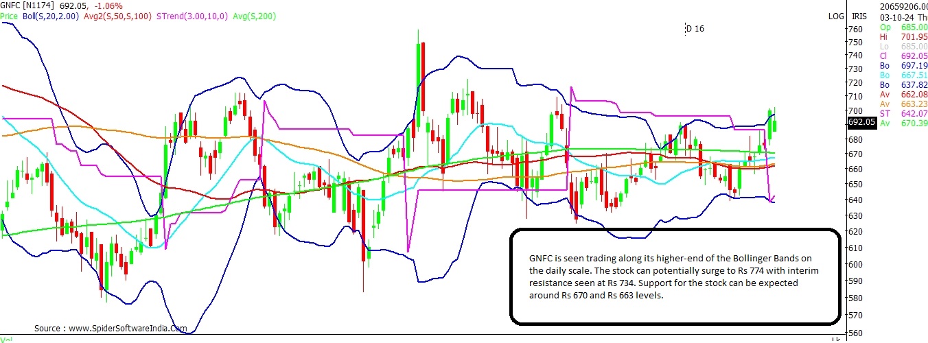 GNFC stock is seen trading along the higher-end of the Bollinger Bands on the daily scale. The long-term chart suggests that the stock can potentially rally to Rs 774; with interim resistance likely around Rs 734. Support for the stock is visible at Rs 670 and Rs 663 levels. CLICK HERE FOR THE CHART